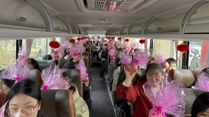 3月11日,春运的第38天,许昌幼儿师范学校的学生离校返家。许昌万里客运有限责任公司开行校园直通车随即跟进,执行客班任务。将团建理念融入校园出行服务,同时开展“学雷锋·文明实践我行动”主题活动。 “安全为要,精细服务,暖心护航。”万里运业股份有限公司总经理陈奕霖在司乘人员岗前叮嘱时表示。校园直通车专班带领车组,融合志愿服务与春运服务,彰显万里运业的责任担当与品牌形象。 按照许昌万里文化建设方案,用创新服务打破常规,向乘客送平安、送祝福、送惊喜,将中原传统文化、许昌三国文化、许昌万里文化融入十米车厢。 在发车前,车组精心装扮车厢,向乘客赠送苹果、节节高,祝大家旅途平安,学业生活节节高。 在停靠点,车组举办猜谜语、盲盒抽奖等特色文化活动,让每一位旅客的归途更加舒心、幸福更可触摸。 谈及乘车体验,韩同学表示:“这趟校园直通车体验满分,全程超舒服。我特别开心,非常感谢驾驶员师傅、协乘员姐姐!”